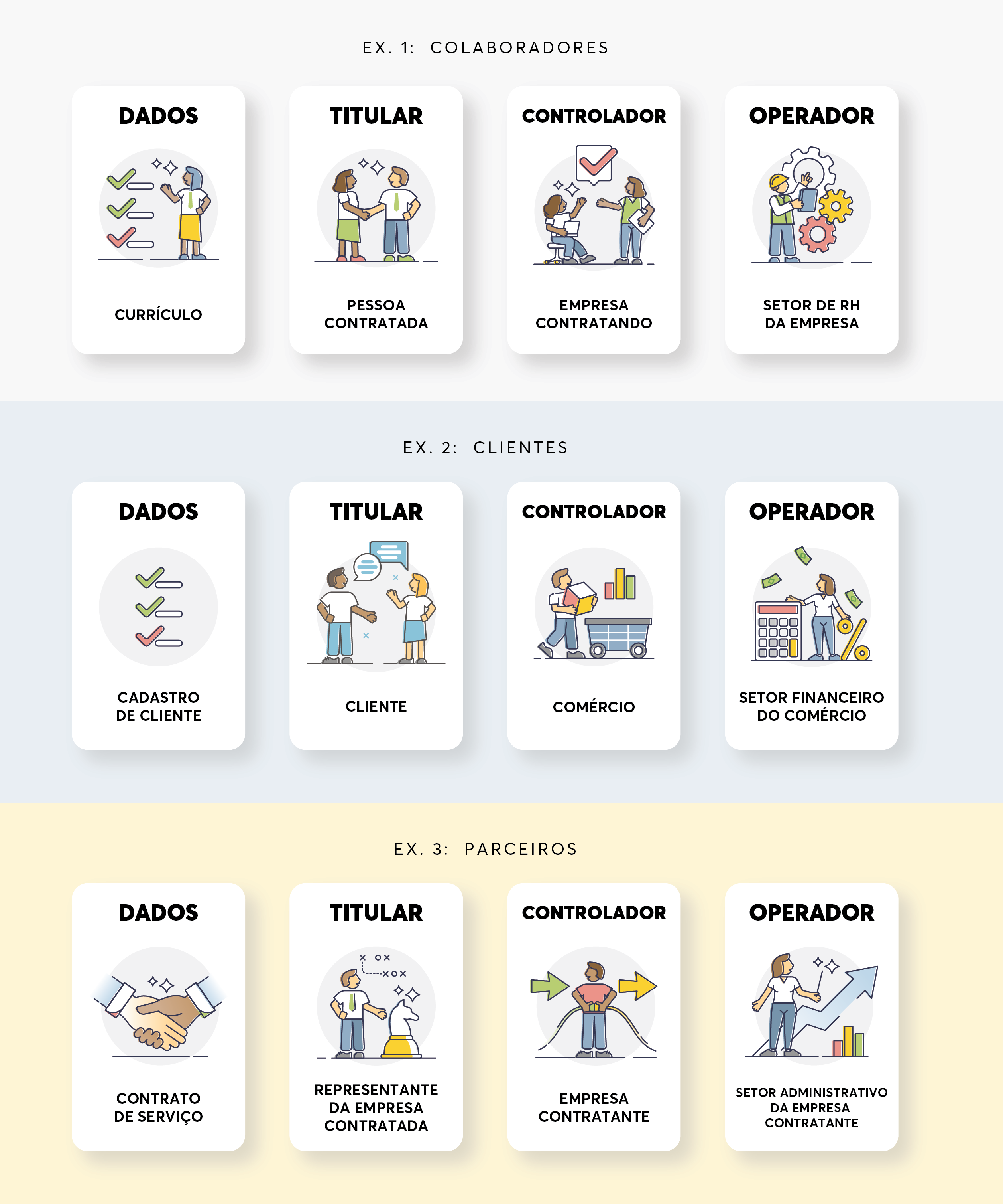 A LGPD traz quatro figuras. A primeira figura são os Dados, ou seja, as informações que podem identificar uma pessoa. A segunda figura é o Titular, que é a pessoa que é identificada pelos dados. A terceira figura é o Controlador dos Dados, que é a empresa que coleta suas informações. E a quarta e última figura é o Operador de Dados, essa figura pode ser uma pessoa ou uma empresa que é escolhida pelo Controlador para trabalhar com os dados coletados.